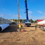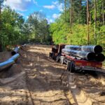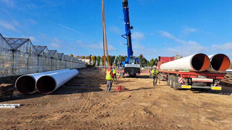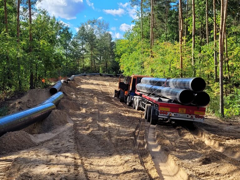 W 2022 roku uczestniczyliśmy w budowie gazociągu wysokiego ciśnienia DN 1000 o długości około 100 km, przebiegającego przez województwa mazowieckie i łódzkie, obejmującego 15 gmin, w tym Gostynin, Szczawin Kościelny, Pacyna, Oporów, Bedlno, Żychlin, Zduny, Łowicz, Łyszkowice, Maków, Godzianów, Głuchów, Skierniewice, Nowy Kawęczyn oraz Rawa Mazowiecka. Nasz zakres prac obejmował budowę zjazdów, montaż przepustów, dystrybucję i rozładunek rur, prace ziemne oraz rozwózkę obciążników. Wyzwania terenowe obejmowały konieczność przekroczenia licznych cieków wodnych oraz terenów podmokłych, co wymagało zastosowania metod bezwykopowych, takich jak przewierty sterowane. Dodatkowo, prace w obszarach rolniczych wymagały koordynacji z lokalnymi rolnikami w celu minimalizacji wpływu na ich działalność.